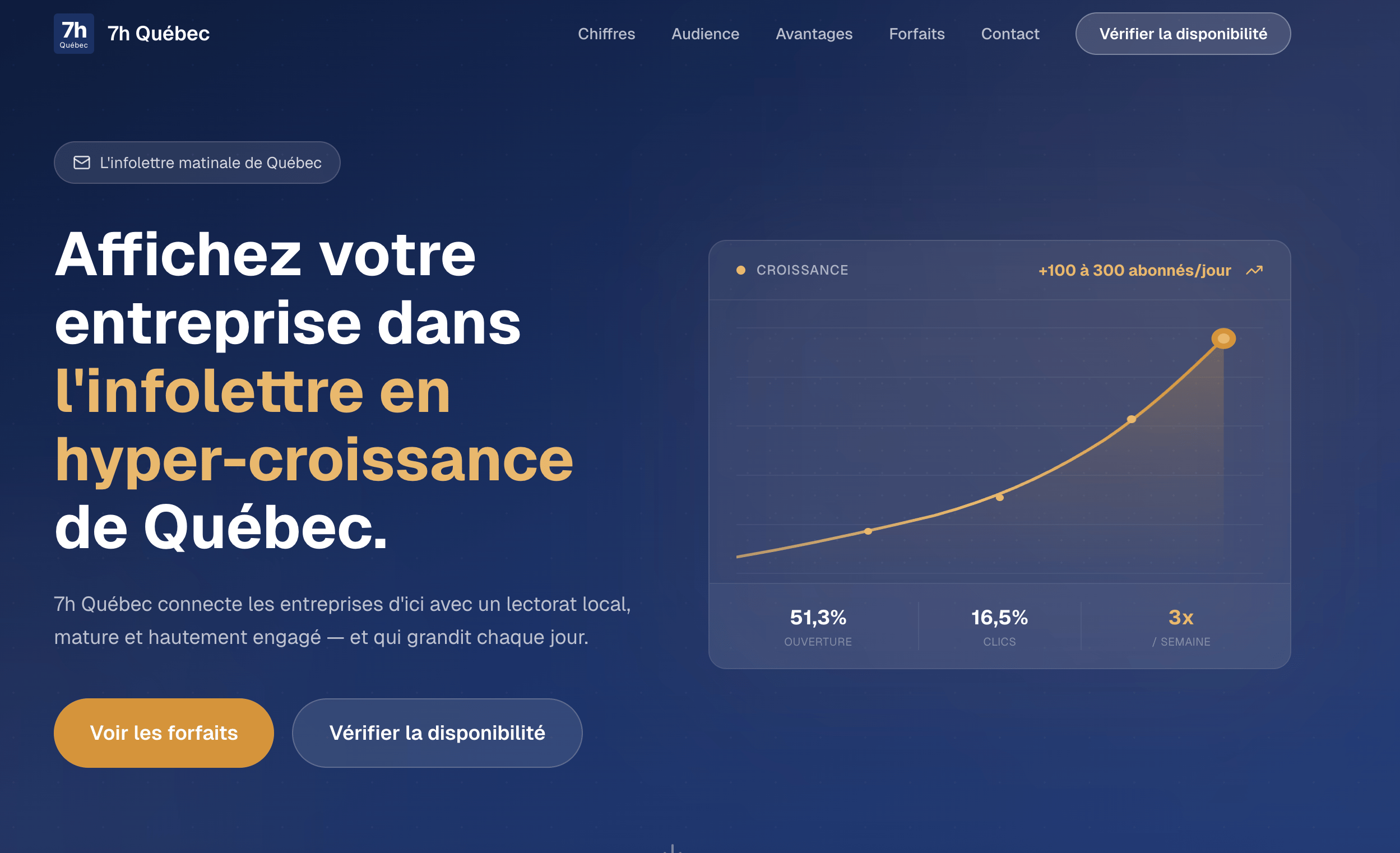 7h Québec grandit vite ! Nous sommes maintenant 2 800 passionnés à lire l'actualité de la ville ici chaque matin. Vous êtes un entrepreneur d'ici et vous cherchez une façon simple et élégante de rejoindre vos futurs clients ? On a quelques espaces disponibles pour les prochaines semaines.