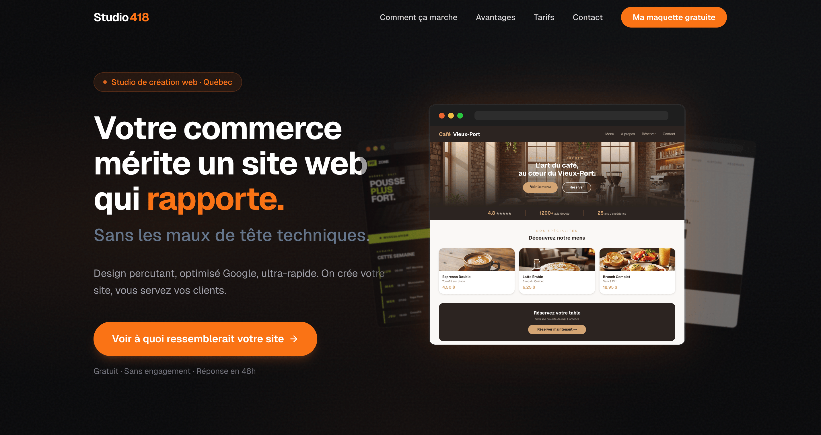 Studio 418 réinvente la création web pour les commerces de Québec avec une approche 100 % sans friction : partagez l'adresse de votre site actuel et recevez une maquette visuelle de votre future version en 48h. Aucun appel requis, aucune obligation, juste de beaux résultats.